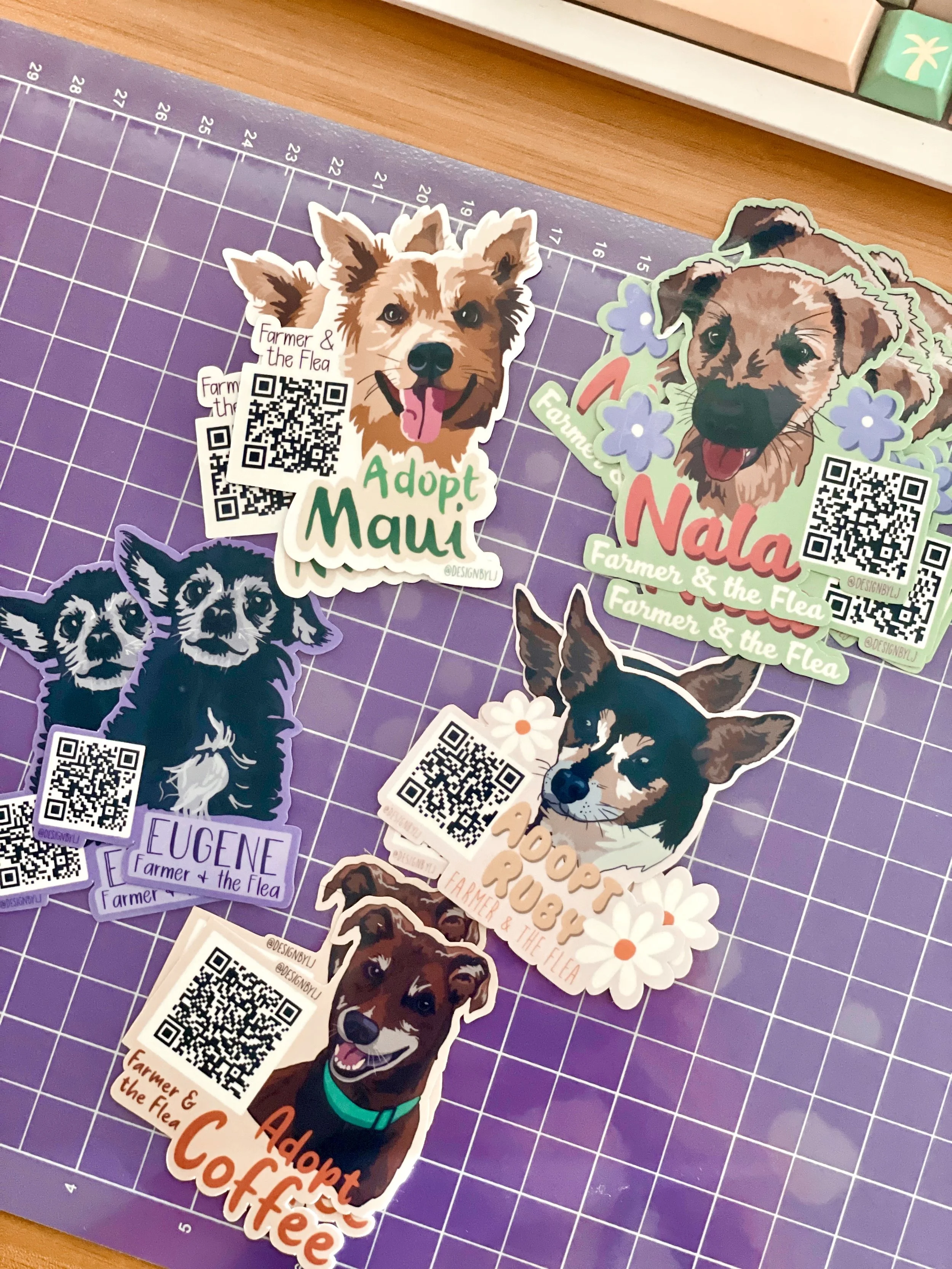 We created and donated a series of stickers for Farmer and the Fleas’ Rescue Rhythms concert, an event celebrating rescue animals through music and art. The rescue sent us photos of adoptable dogs, and I painted each one to capture their personality before turning the portraits into stickers to help promote adoption. These stickers were shared at the concert—headlined by artists like Trevor Hall and Will Evans—as a creative way to spotlight rescue dogs and support the cause.